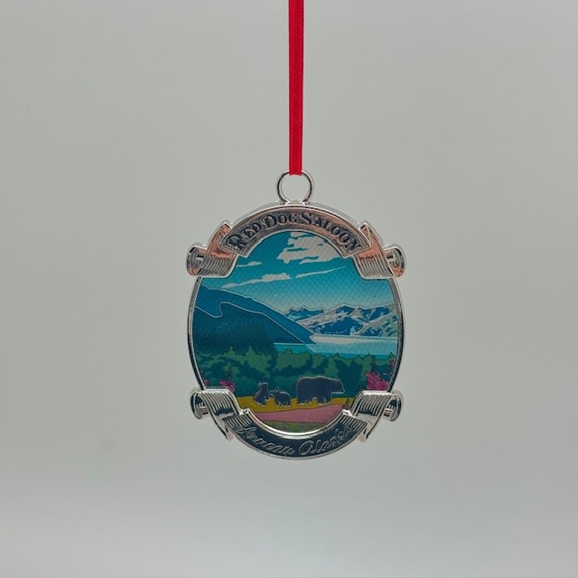 Metal ornament featuring “Red Dog Saloon, Juneau, Alaska” with the Mendenhall Glacier in the background and bears playing